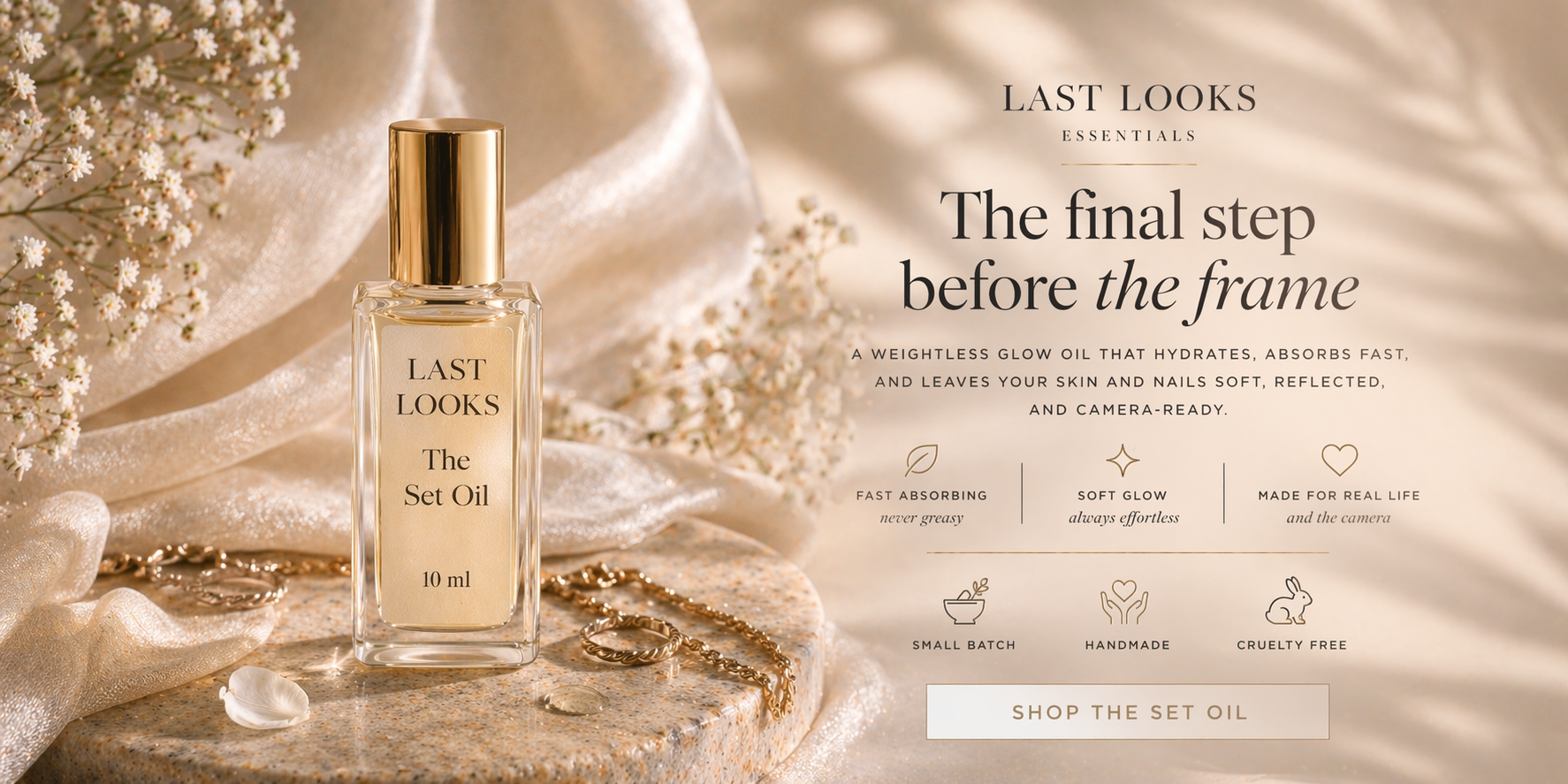 After years of working in front of the lens, I found myself searching for something that didn’t quite exist—an oil that felt lightweight, absorbed instantly, and added that final, effortless touch before stepping into frame. So I created it.